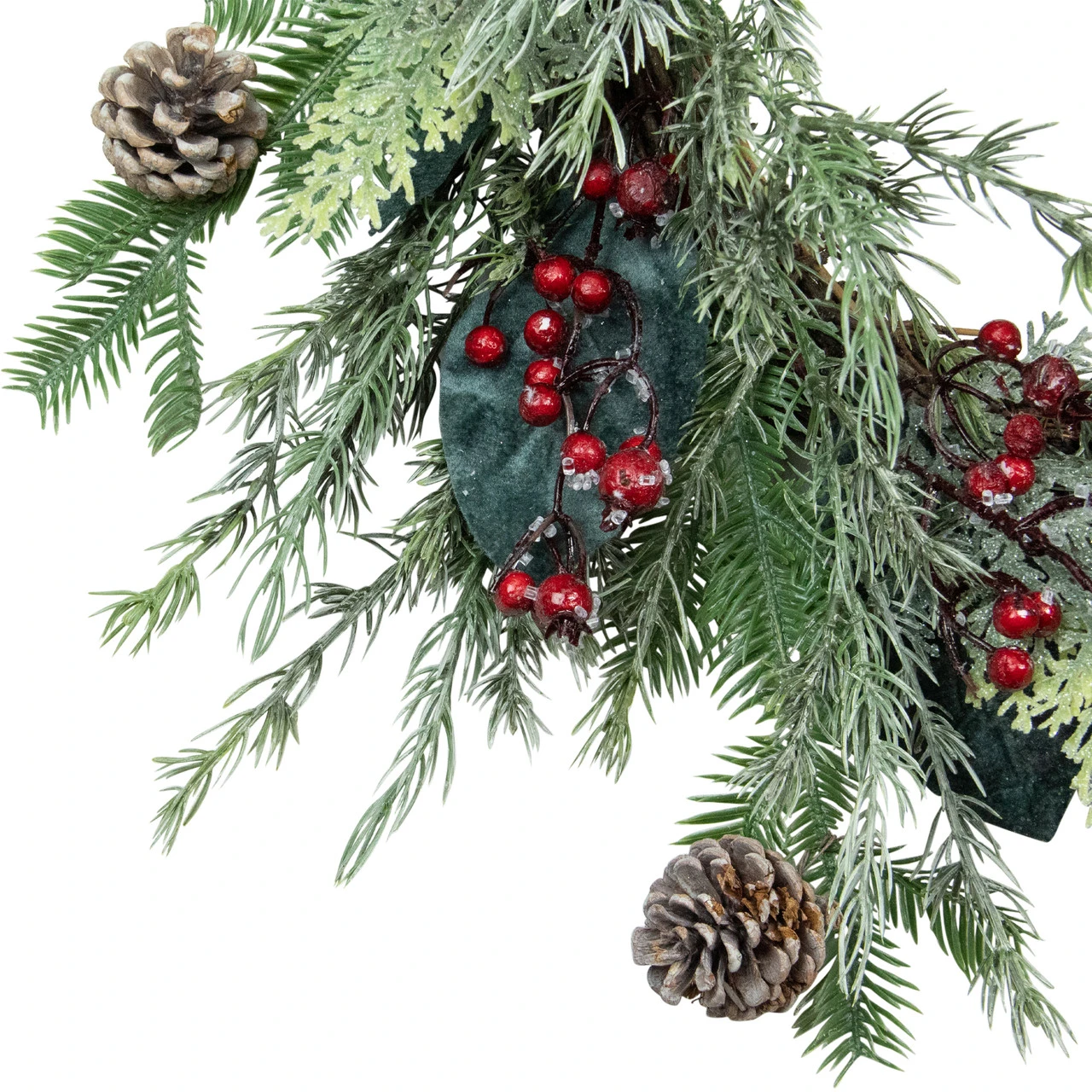 Accented with foliage, iced berries, and pine cones