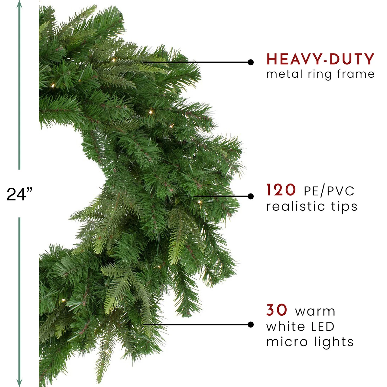 Dimensions: 24″ diameter (measured from outermost tip to outermost tip across the wreath)