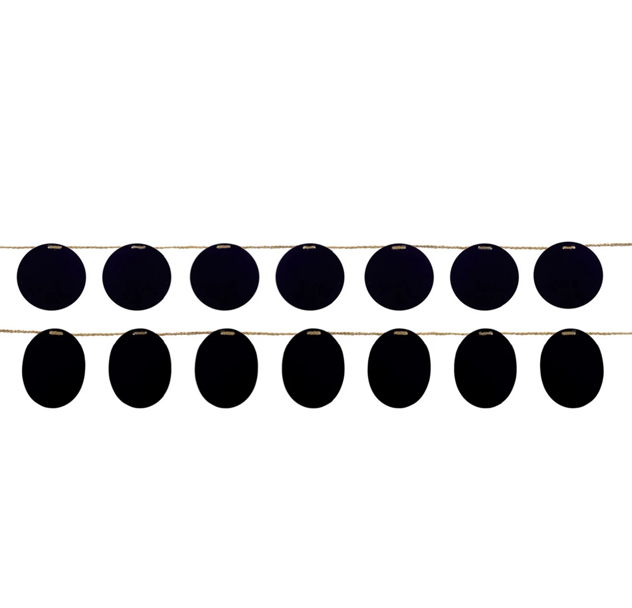 Features (2) strings of garland with oval and round chalkboards
