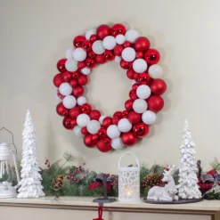 White And Red 3-Finish Shatterproof Ball Christmas Wreath – 24-Inch, Unlit