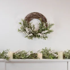 Artificial Christmas Twig Wreath With Frosted Foliage And Berries, 24-Inch, Unlit